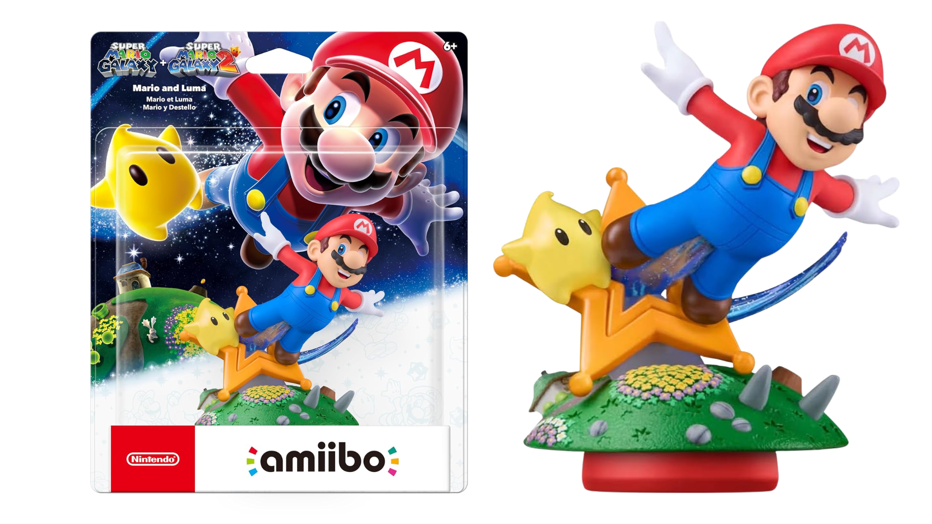 Esta figura amiibo é maior que o tamanho padrão e mostra Mario voando para o espaço com um Luma logo atrás. Nos jogos Super Mario Galaxy e Super Mario Galaxy 2, toque na figura amiibo de Mario e Luma para receber um Cogumelo da Vida.