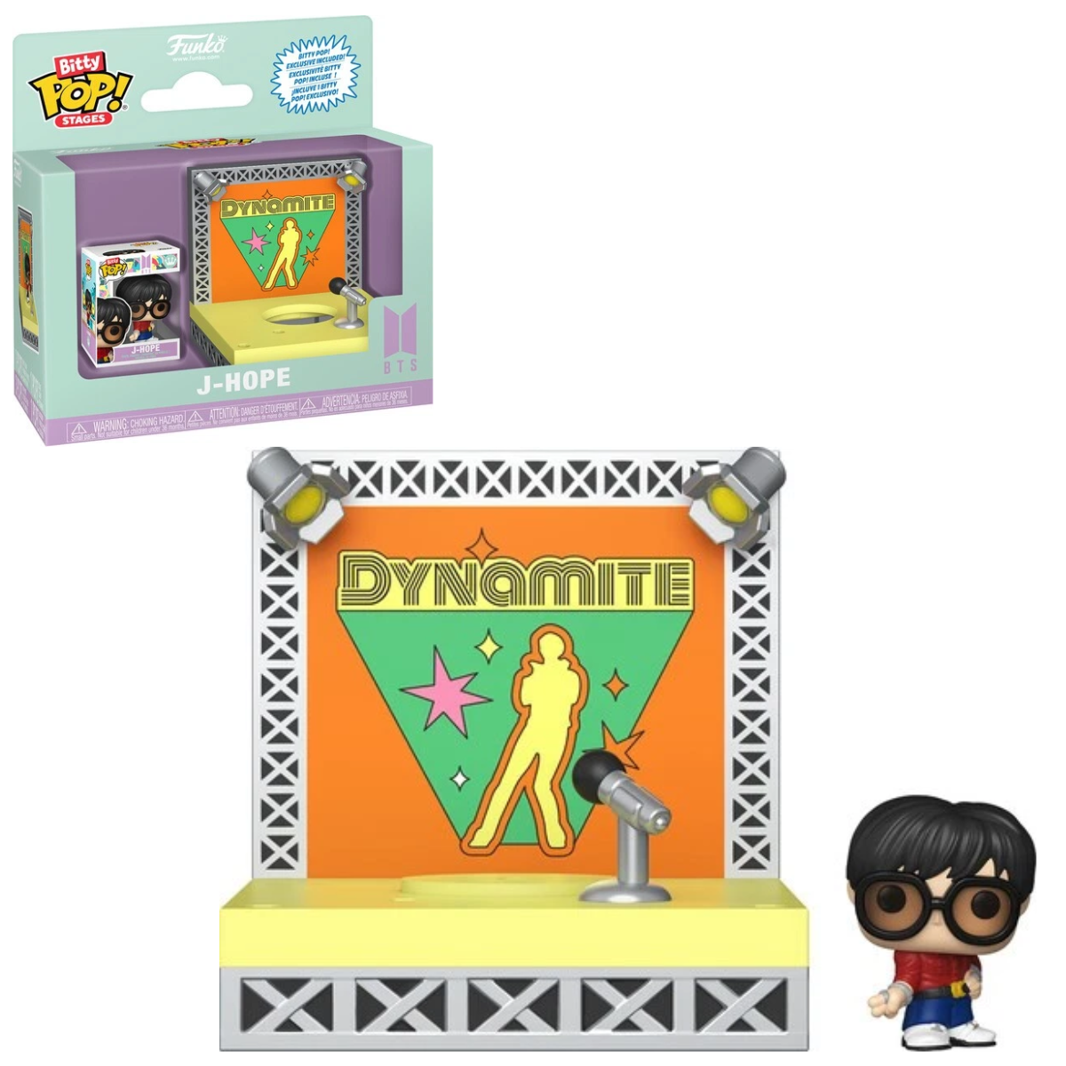 Remova o Bitty POP! J-HOPE da caixa de acrílico para posicioná-lo no Palco Bitty POP! “Dynamite” e reviver o icônico momento do grupo diretamente na sua estante!