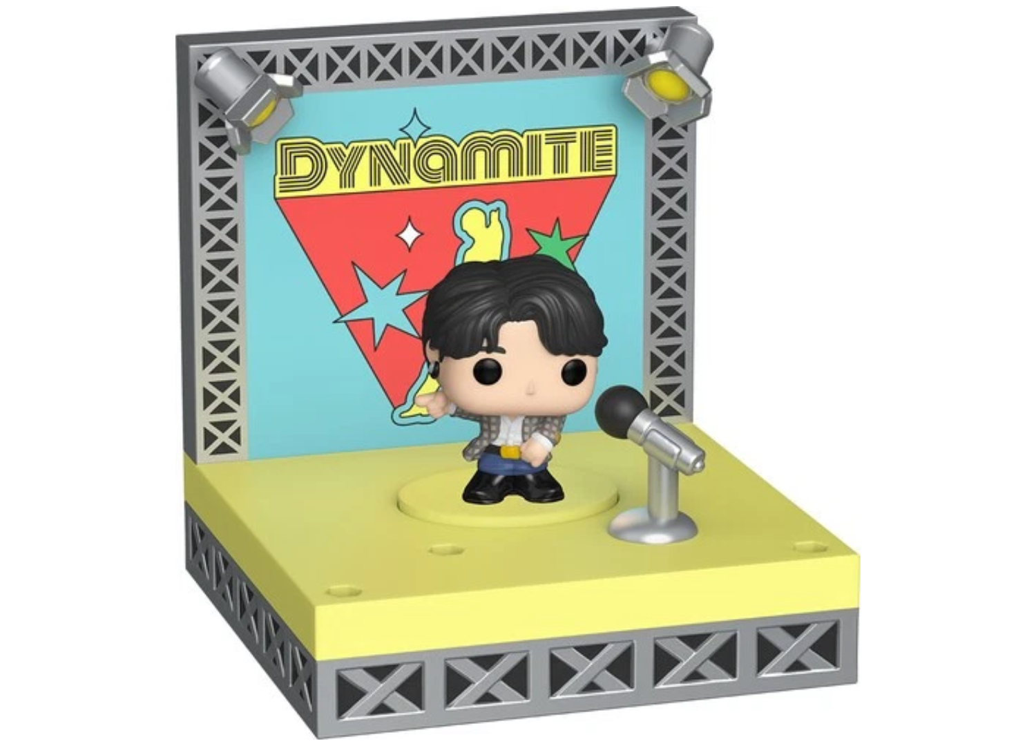 Remova o Bitty POP! JUNG KOOK da caixa de acrílico para posicioná-lo no Palco Bitty POP! “Dynamite” e reviver o icônico momento do grupo diretamente na sua estante!