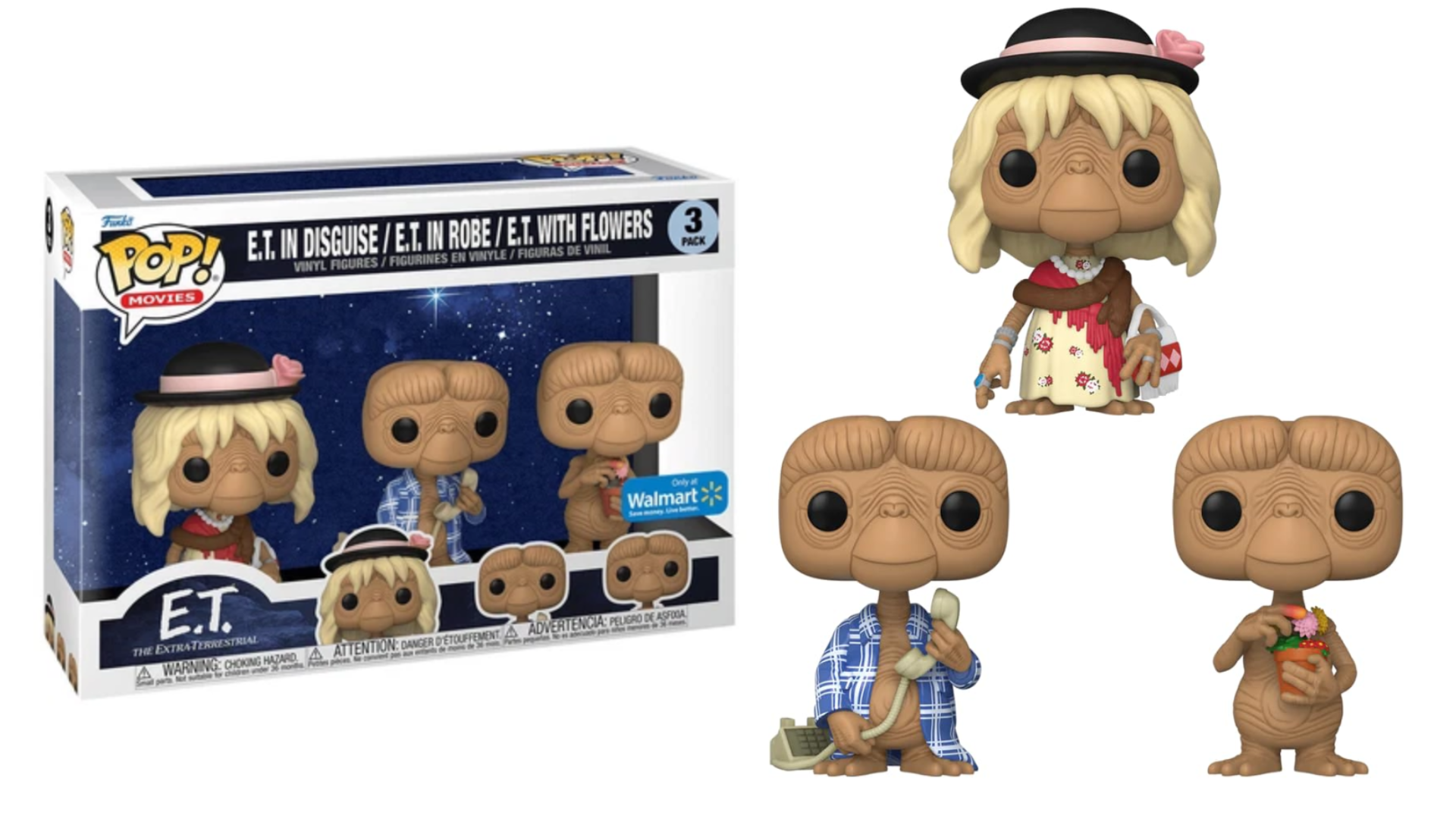 Inspirado no clássico E.T. the Extra-Terrestrial, o Funko Pop E.T. Extraterrestre Disguise, Robe, Flowers 3 Pack reúne três momentos especiais desse personagem tão querido. Cada versão relembra um pouco da jornada de E.T. na Terra; cheia de descobertas, carinho e momentos que ficaram gravados na memória de quem assistiu ao filme.