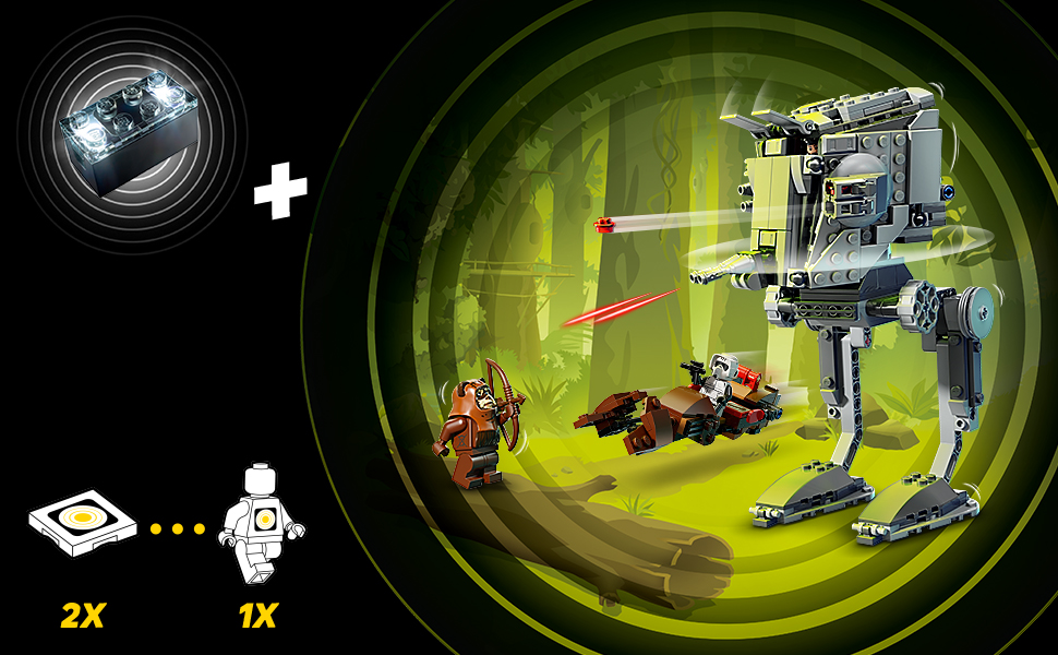 Cuidado com o AT-ST! Ajude o SMART Wicket a derrotar o Império em Endor. Adicione uma peça LEGO SMART BRICK (incluída separadamente nos conjuntos Tudo-em-Um) a este conjunto compatível com LEGO SMART Play para ouvir o motor do AT-ST, sons de passos e disparos de laser.